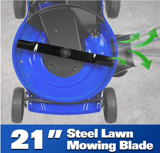 3-in-1 Steel Deck - The 21-inch alloy steel deck supports mulching, rear bagging, and side discharge. That flexibility helps adapt to seasonal changes, for example, mulching in summer and bagging during heavy leaf fall.