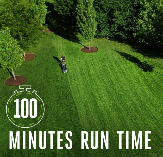 Runtime is quoted at up to 100 minutes using both 6.0Ah batteries combined. That sounds impressive, but like most cordless mowers, actual runtime may be lower in thick or damp grass.