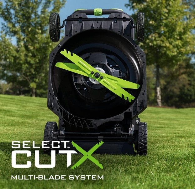 1, Strong Overall Cutting Power for a Cordless Mower - Handles regular residential grass well and supports thicker growth when blades are sharp. Select Cut multi-blade system helps tailor performance for mulching or bagging. Maintains blade speed under load better than many lower-powered cordless models