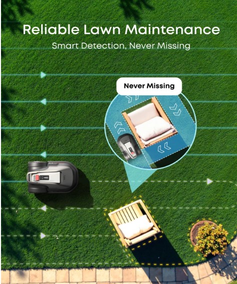 The E15 relies on a 3D perception system using cameras and intelligent algorithms. It detects obstacles and plans parallel mowing paths for more uniform coverage. It also includes smart coverage detection to reduce missed patches. This approach removes the need for extra hardware, but it does mean performance may depend on lighting conditions and lawn layout.