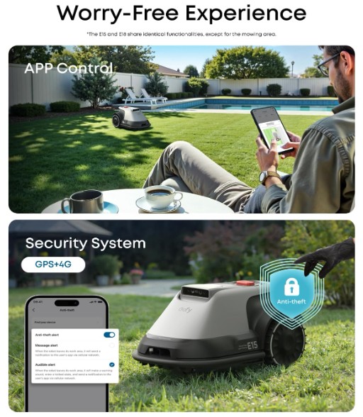 Wireless Auto Mapping, No Boundary Wires - One of the headline features is its hands-free auto mapping. The E15 uses vision-based positioning and distance measurement to map lawns up to 0.2 acres, around 8,700 square feet. Setup is advertised as taking about five minutes, with mapping triggered directly from the smartphone app.