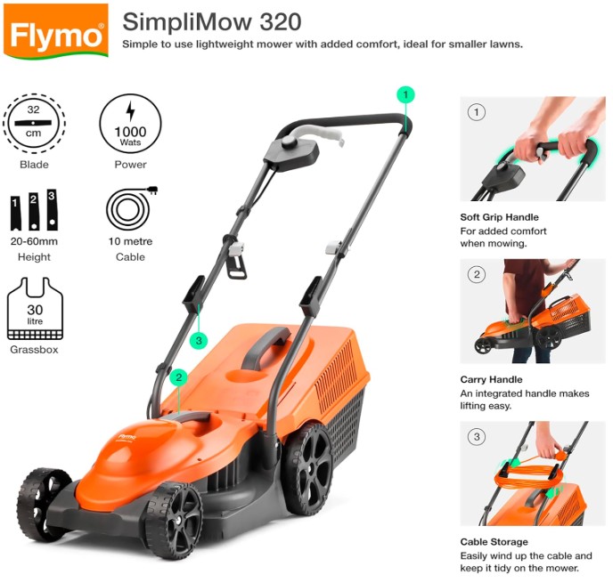 Get the Flymo SimpliMow 320V lawnmower for under £80. Lightweight, compact, and perfect for small gardens on a budget.