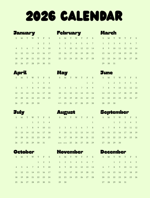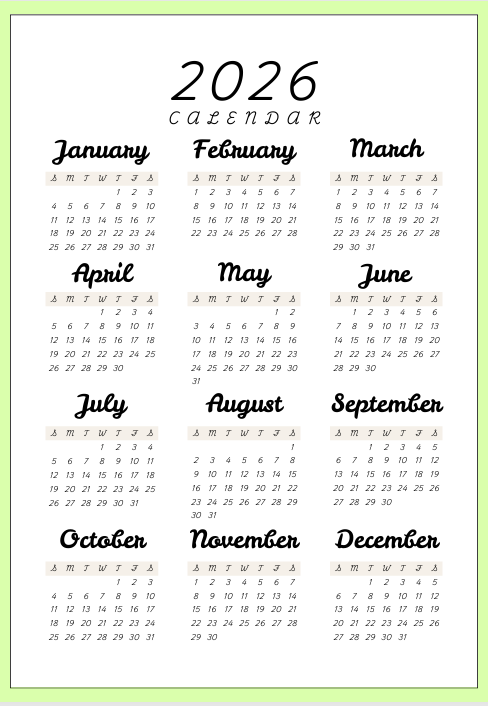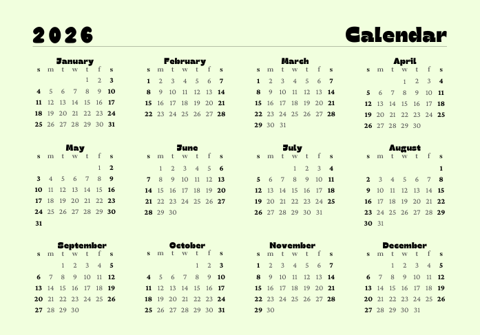 Free downloadable 2026 calendars in portrait and landscape styles. Clean, minimalist design perfect for home, office, or garden use. Easy to read, print, and organize your year.