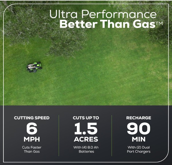 This model runs on a 60V platform and includes four 8.0Ah batteries alongside dual-port turbo chargers. On paper, it is positioned as a serious replacement for a traditional 42-inch gas lawn tractor, with claims of cutting up to 1.5 acres using a “mow, swap, and go” system.