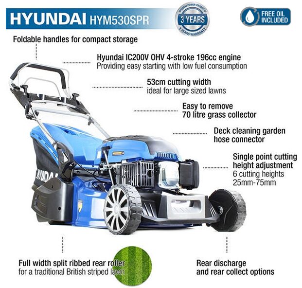 Hyundai 53cm 196cc SP Petrol Roller Lawnmower Sale – Save £91!