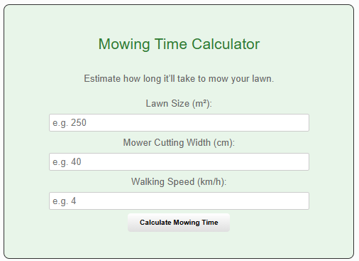 Never look at your long-grass lawn and wonder if you can squeeze in a mow before the rain comes. The Mowing Time Calculator does the thinking for you, giving you an instant estimate of how long it will take to get the job done.