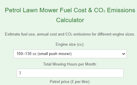 Petrol Lawn Mower Fuel Cost & CO₂ Emissions Calculator